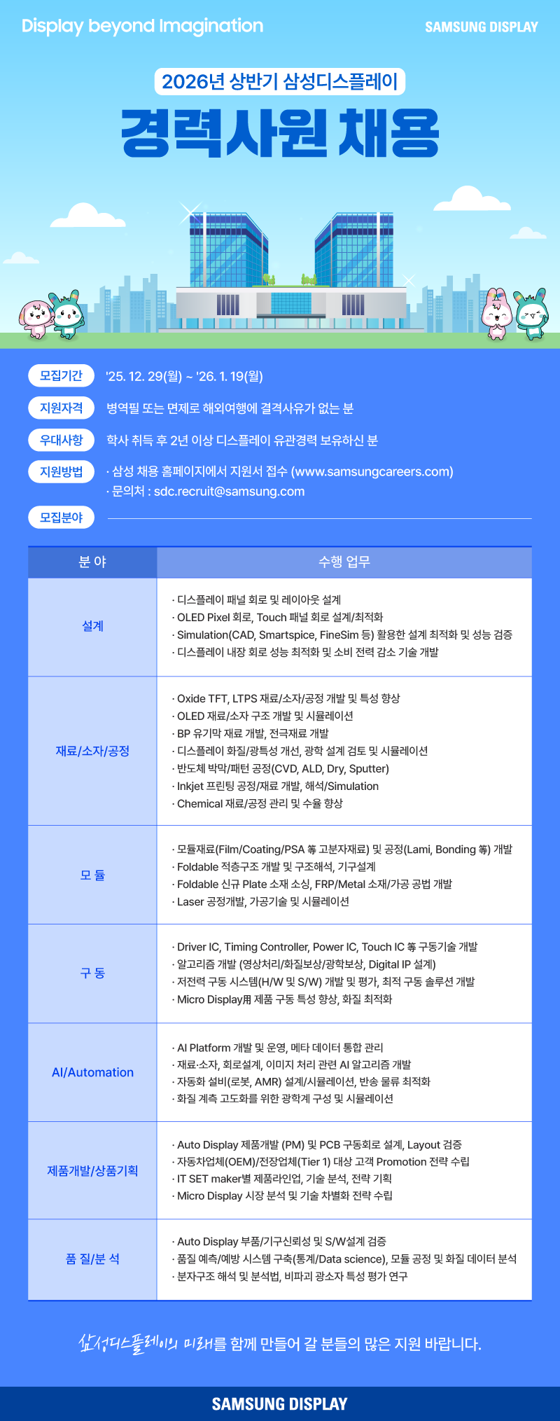 삼성디스플레이가 2026년 상반기 경력사원을 채용합니다.