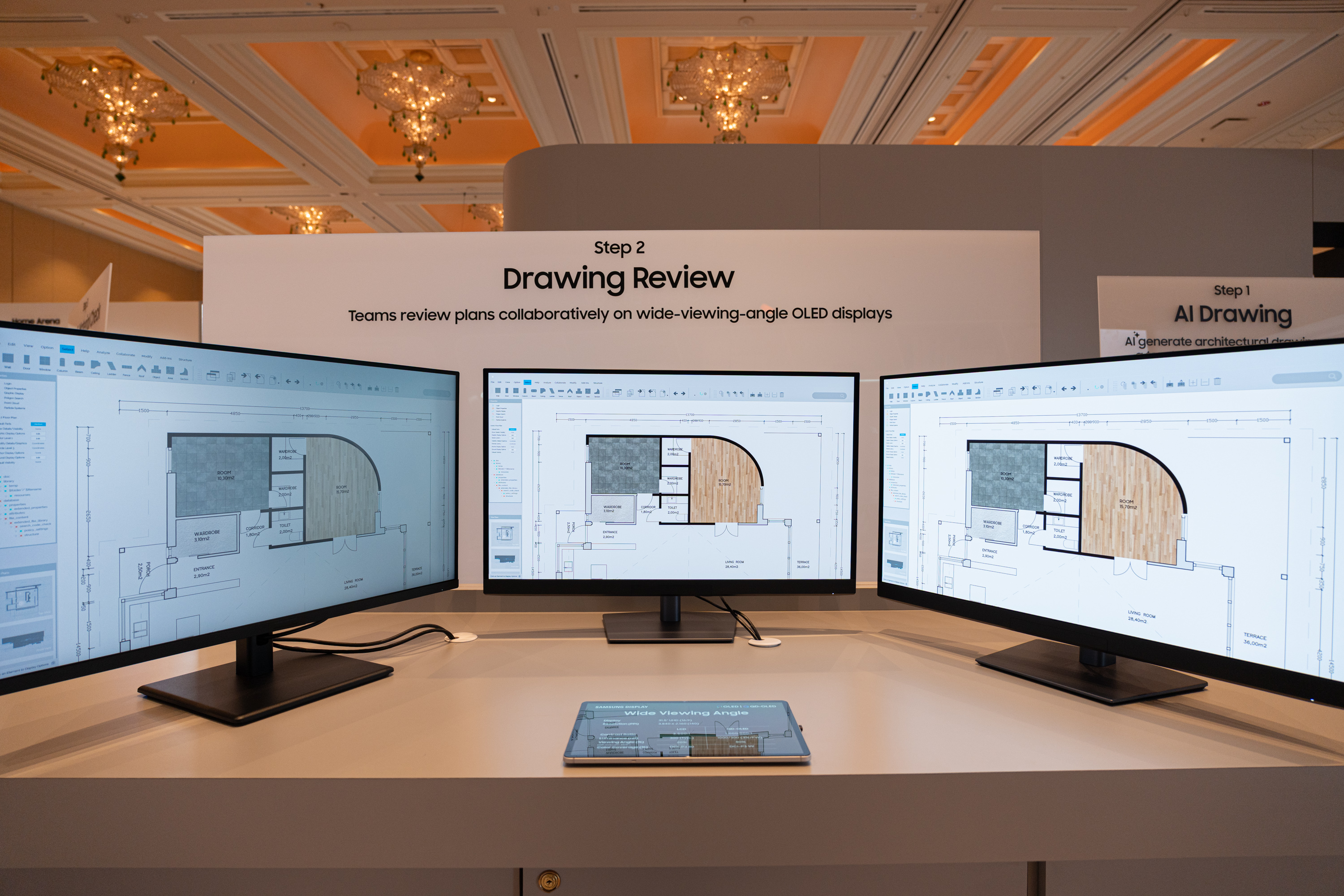 건축사무소 테마로 꾸며진 전시 공간에는 삼성 OLED의 뛰어난 색 재현력과 암부 표현력, 휘도, 시야각 강점을 확인할 수 있다. AI를 활용한 디지털 설계 환경에서 직원들은 다양한 설계도면과 재질 시안, 색상 등을 화면으로 공유하게 되는데, 이때 OLED는 설계자의 구상과 디자인을 왜곡 없이 반영하고 전달하는 최적의 디스플레이다.