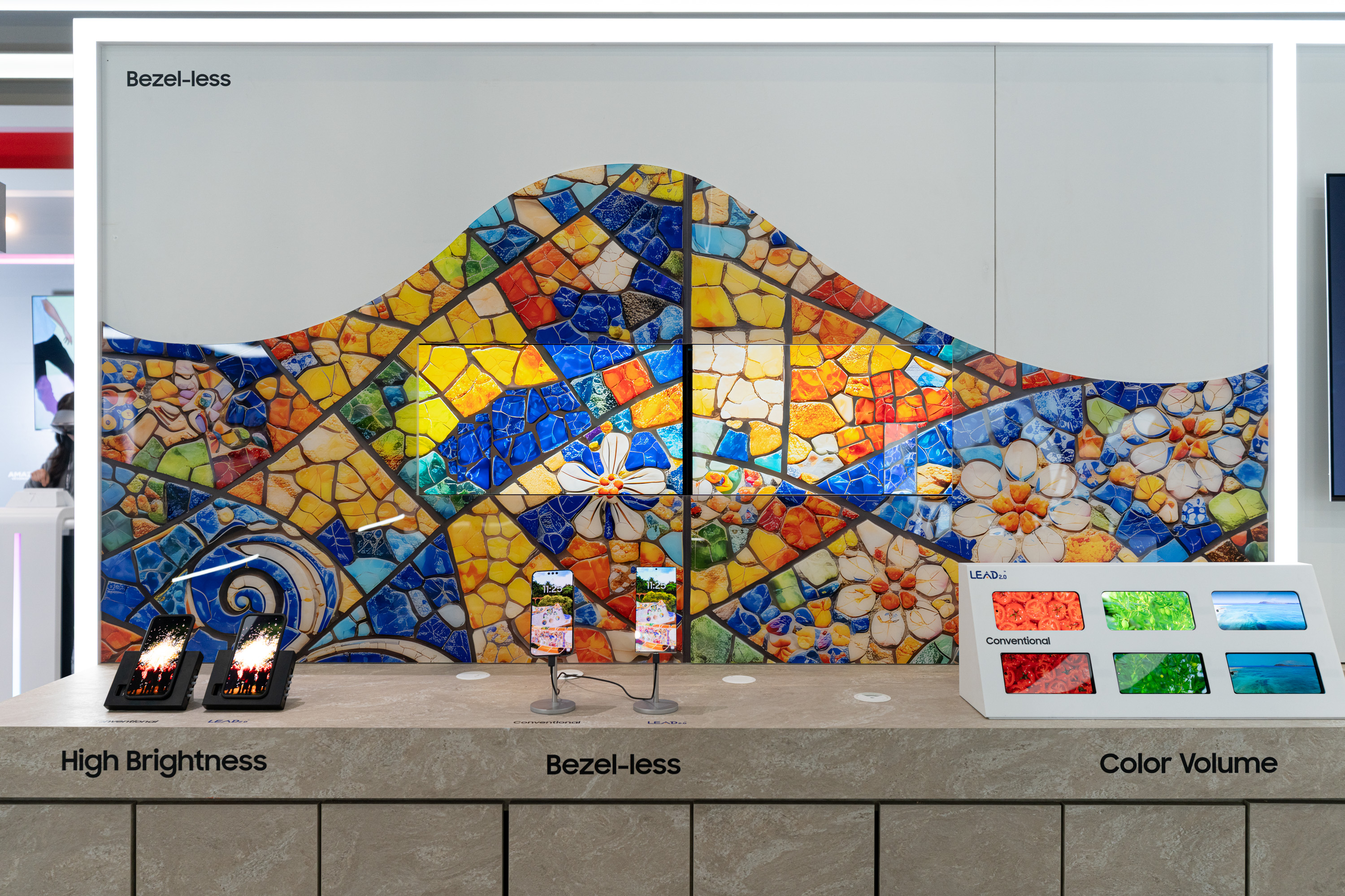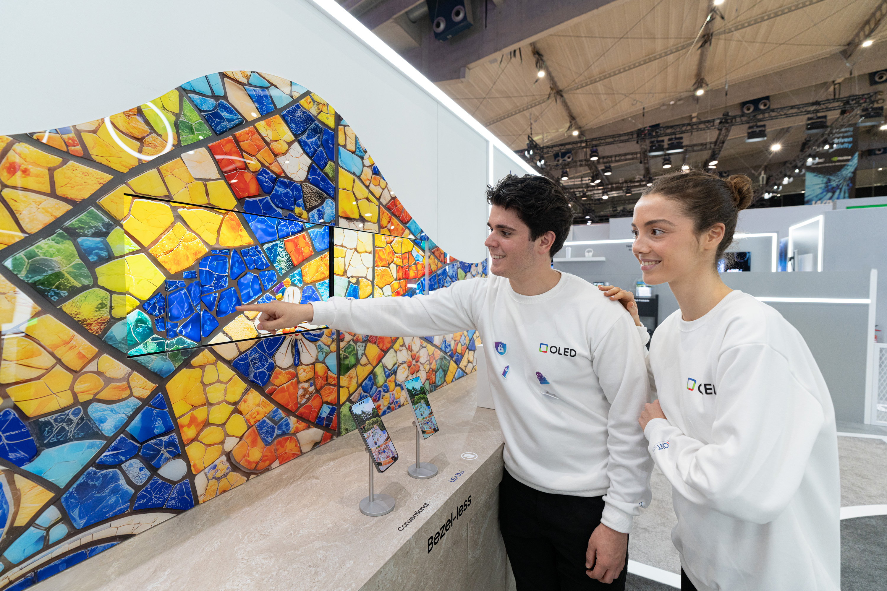 바르셀로나의 대표 명소인 구엘 공원에서 영감을 받은 '베젤리스 OLED 월(Bezel-less Wall)'도 이번 전시의 백미다. 6.8형 OLED 2대, 27형 QD-OLED 2대를 타일 모자이크처럼 연결해, 경계가 거의 느껴지지 않는 '초슬림 베젤' 기술을 시각적으로 보여준다.