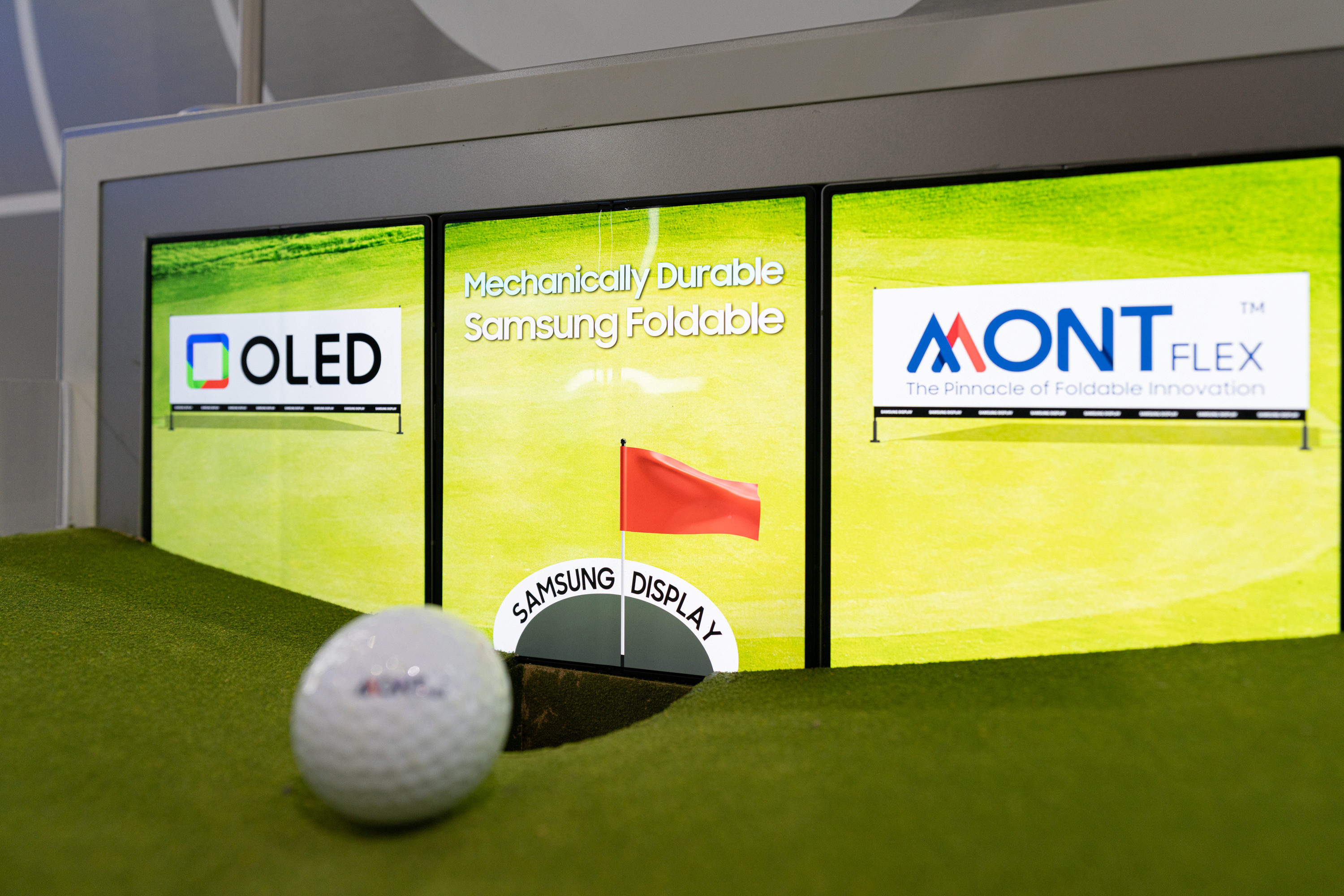 폴더블 OLED의 강한 내구성을 직접 체험할 수 있는 AI 스포츠 디스트릭트 전시도 큰 화제다. 삼성디스플레이는 자동 골프 퍼팅기를 전시장에 설치, 폴더블 스마트폰을 홀(Hole) 삼아 폴더블 패널의 내구성 테스트를 진행한다.