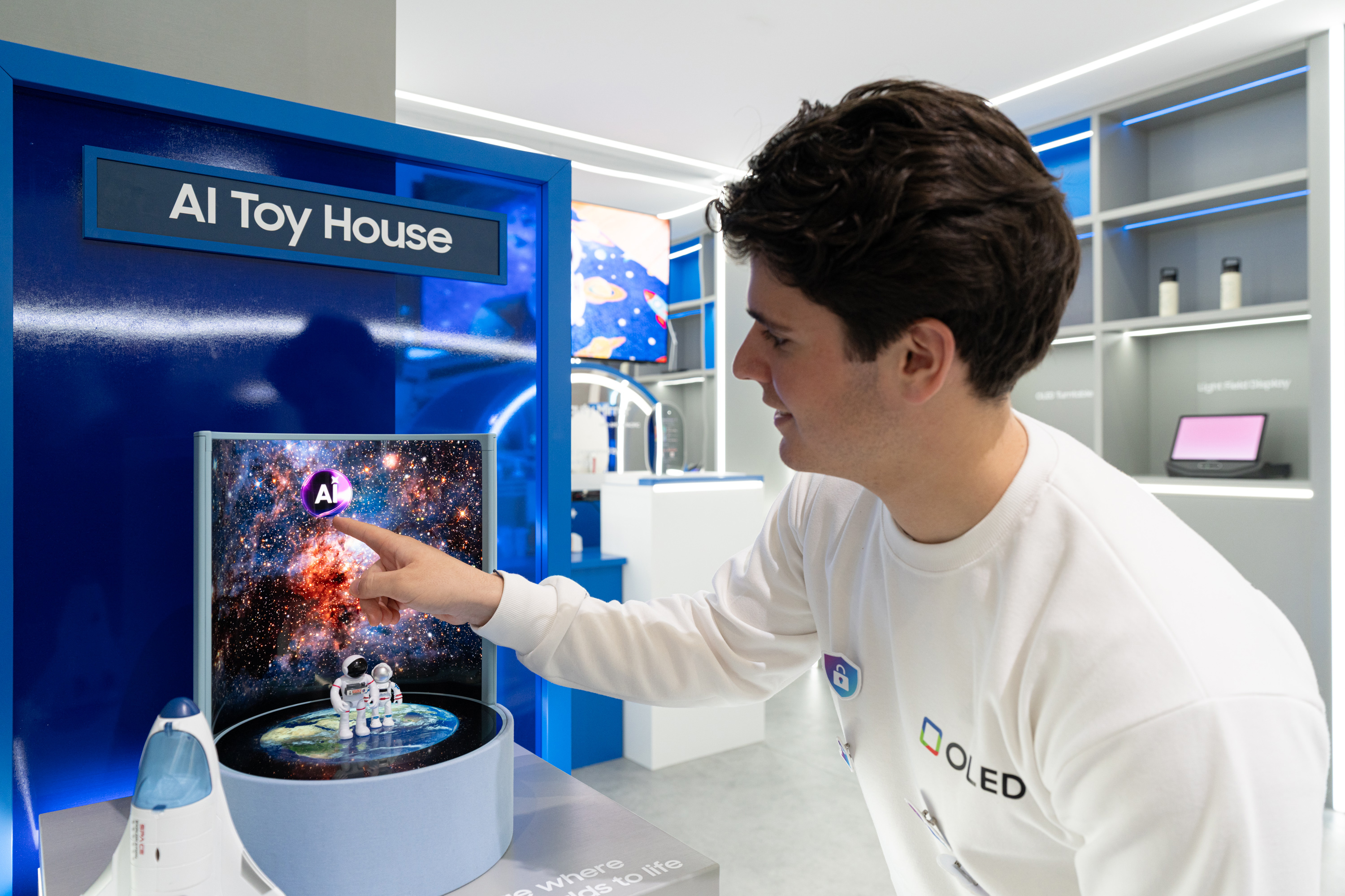 'AI 토이 하우스(Toy House)'도 이번 전시에서 처음 공개되는 콘셉트 제품이다. 13.4형 원형 OLED와 접거나 구부릴 수 있는 18.1형 플렉시블 OLED로 디지털 쇼케이스를 제작, 피규어나 장난감을 전시하는 진열대나 인테리어 소품으로 활용할 수 있도록 고안됐다. 현재는 우주와 한옥을 배경으로 디자인됐으며 향후 AI 기능과 결합하면 사용자의 기호에 맞게 자동으로 배경 전환이 가능하다.