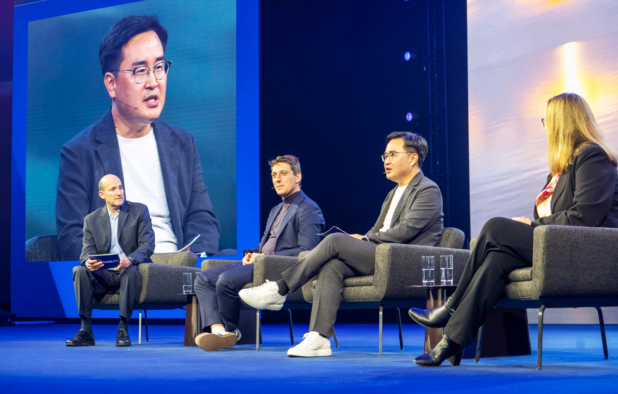 이주형 삼성디스플레이 중소형사업부장(오른쪽 두 번째)이 아우디(Audi) AG 기술개발 이사회 멤버인 제프리 부코(Geoffrey Bouquot, 왼쪽 두 번째) 및 3M 첨단소재·운송제품 플랫폼 부문 사장 에이미 맥러플린(Amy McLaughlin, 오른쪽 첫 번째)과 함께 'IAA 모빌리티 2025' 컨퍼런스에 참석해 발언하고 있는 모습