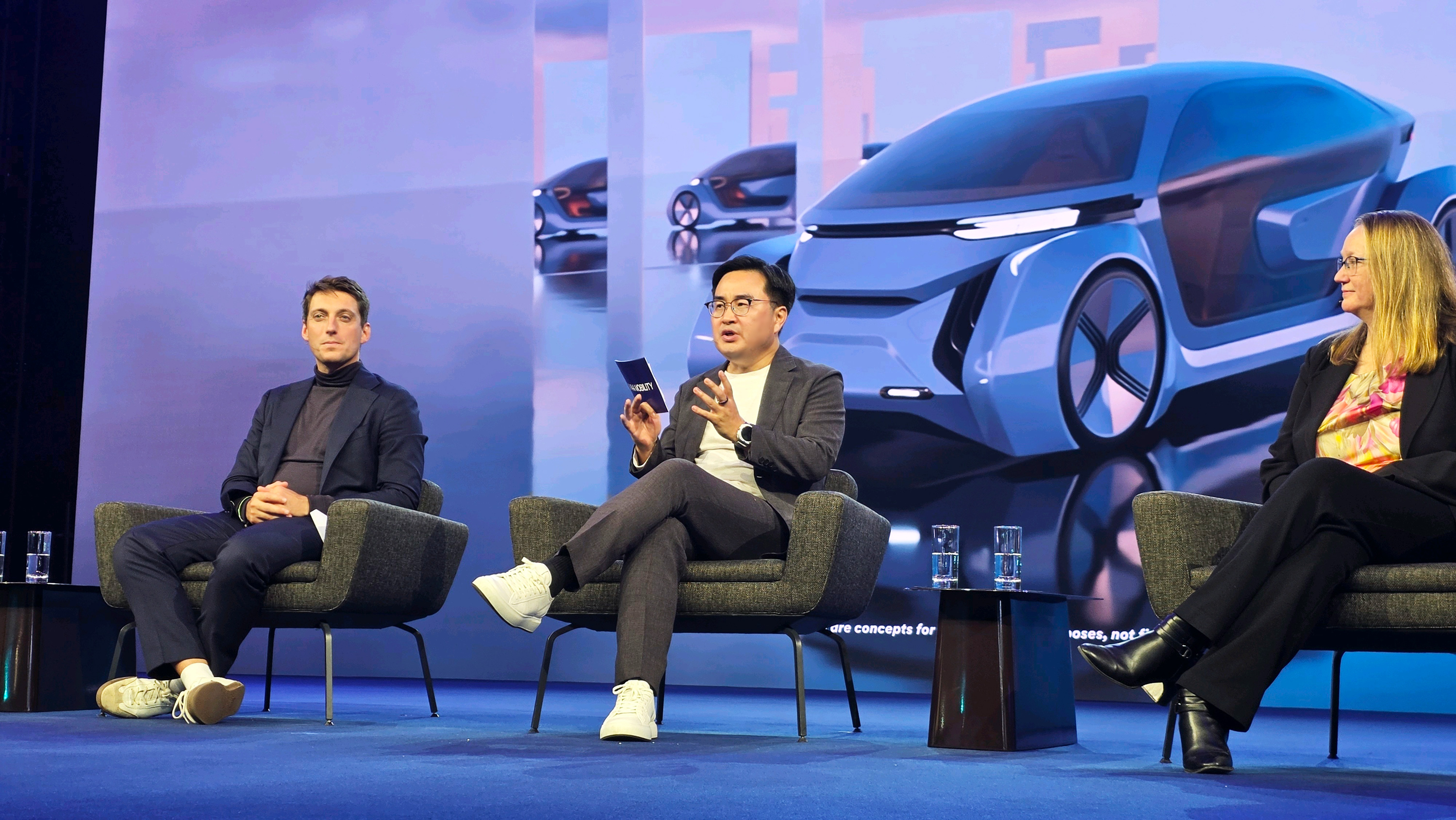 이주형 삼성디스플레이 중소형사업부장(가운데)이 아우디(Audi) AG 기술개발 이사회 멤버인 제프리 부코(Geoffrey Bouquot, 왼쪽) 및 3M 첨단소재·운송제품 플랫폼 부문 사장 에이미 맥러플린(Amy McLaughlin, 오른쪽)과 함께 'IAA 모빌리티 2025' 컨퍼런스에 참석해 발언하고 있는 모습